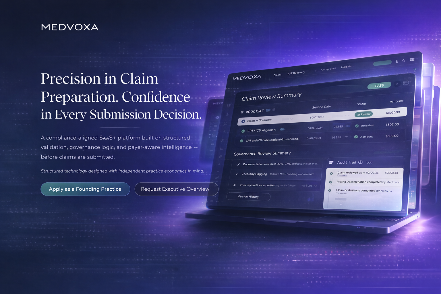 MEDVOXA delivers structured validation, payer-aware governance logic, and audit-traceable automation before claims are submitted — reducing denials and improving reimbursement predictability.